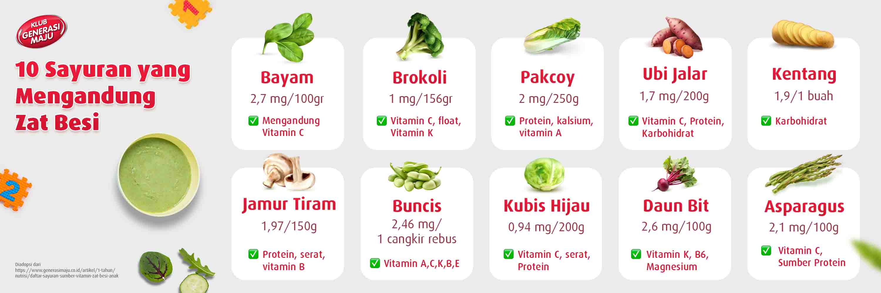 Menurut Angka Kecukupan Gizi (AKG) Kemenkes RI, anak usia 1-3 tahun butuh mendapatkan 7 mg zat besi dari makanan sehari-hari. Berikut beberapa sayuran tinggi zat besi untuk anak:
