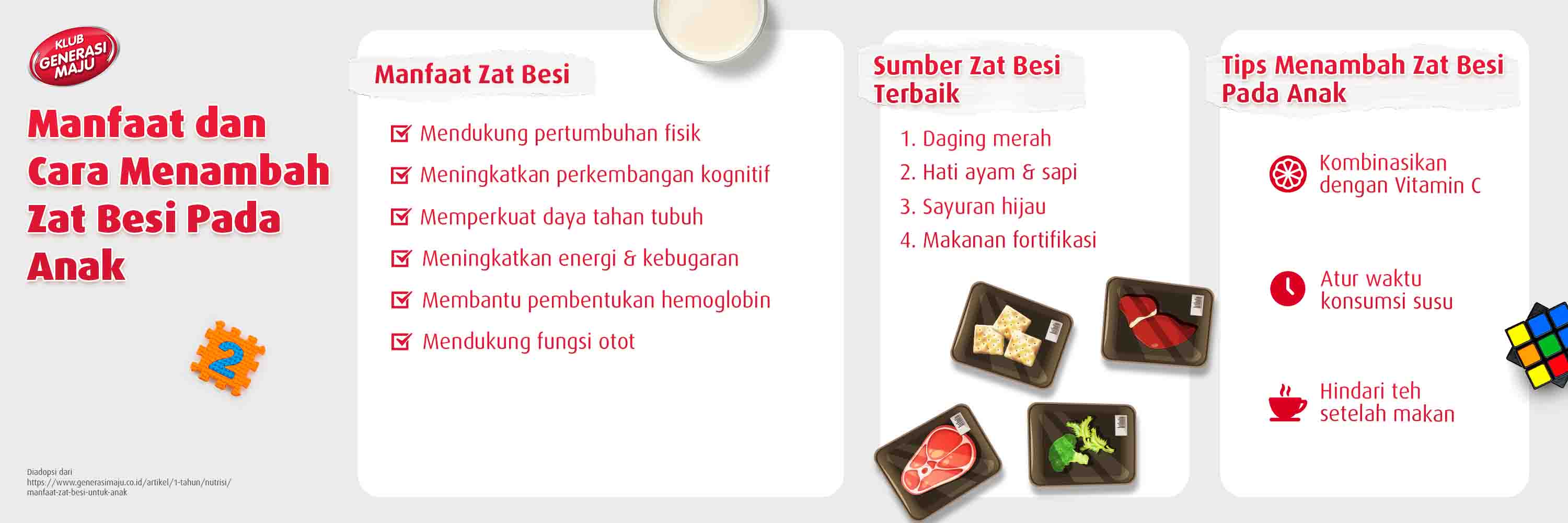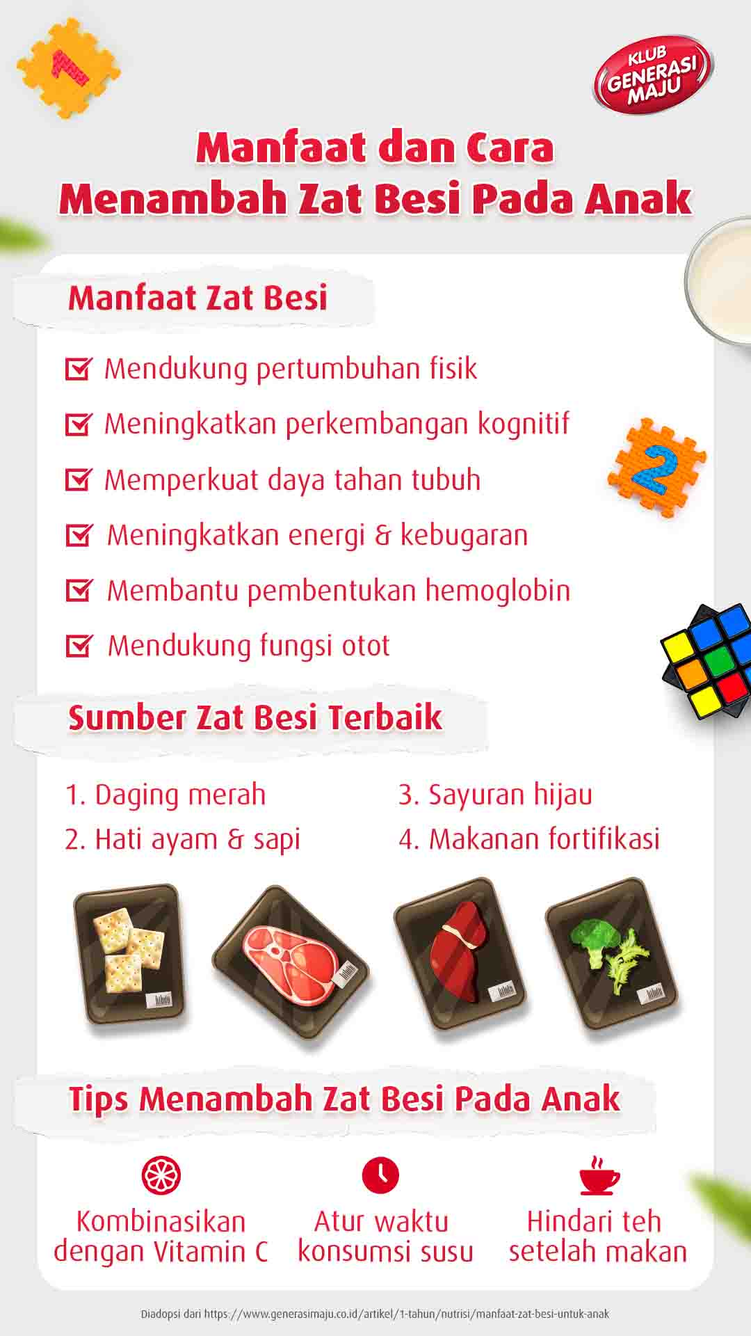 Selain itu, zat besi juga bagian dari mioglobin yang memiliki kandungan asam amino dan poliferin. Kandungan ini berguna untuk menyimpan oksigen di jaringan otot. Manfaat zat besi untuk anak yang paling penting adalah menunjang tumbuh kembang si Kecil, seperti perkembangan kognitif, fisik, hingga daya tahan tubuh. Itulah alasan kenapa setiap anak-anak tidak boleh sampai kekurangan zat besi.