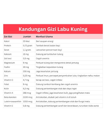 Labu kuning juga mengandung vitamin A, E, dan B6, folat, serta kalium yang baik untuk tumbuh kembang bayi, sehingga cocok dijadikan bahan MPASI bayi 6 bulan.